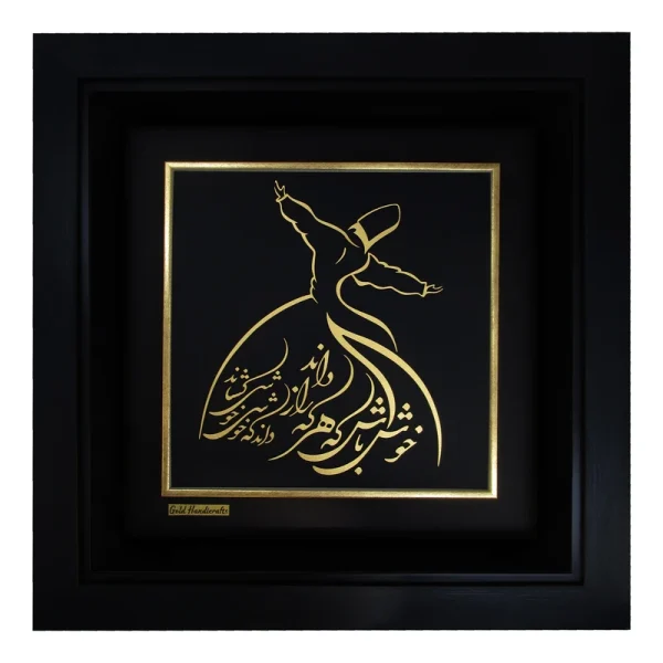 این تابلو با ورق روکش طلا میباشد. این محصول ساخته شده از قاب پی وی سی مشکی رنگ و بصورت مربع میباشد. ساخت تابلوهای ورق طلا یکی از زیباترین هنرها و صنایعدستی ایران به حساب میآید. ابعاد تابلوی طرح رقص سماع 30×30 سانتیمتر میباشد و تمامی طرحهای این تابلو با دقت و ظرافت خاصی تولید شده است که این موضوع ارزش آن را دو چندان کرده است.این محصول به همراه جعبه چوبی شکیل ارائه میشود که زیبایی آن را دو چندان کرده است. سماع به نوعی از رقص صوفیه شامل چرخش بدن همراه با حالت خلسه برای اهداف معنوی گفته میشود. سماع پیشینهٔ کهن تاریخی داشته و پس از اسلام موافقان و مخالفانی نیز در این دین پیدا نمودهاست یا به عبارت دیگر سماع از به حرکت درآمدن گروه شیفتگان تحت تأثیر آوای دف و نی و تنبور و شعرهای آهنگین است. سماء گویند که صوفیان چون در هنگام وجد روی به آسمان کنند و گنج معنی از آسمان گیرند آن را سماء که واژه ای است اوستایی به معنی آسمان نامیده شده همچنانکه نخستین کسی که سماء کرد خسرو کیانی بود که از خداوند معنی رازی را میجست چنین پنج هفته خروشان به پای همی بود بر پیش گیهان خدای همچنین سماع در لغت در معنای شنیدن، رقص و وجد است و در اصطلاح بر آوازی اطلاق میشود که حال شنونده را منقلب گرداند.