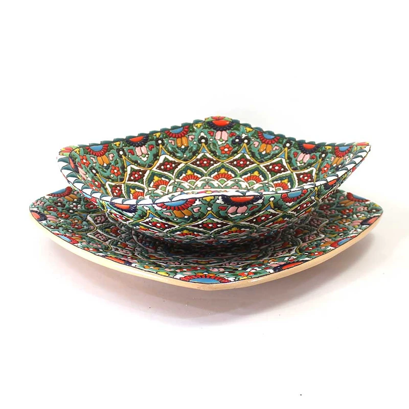 ظروف فیروزه کوبی اصفهان با زیربنای فلزی که با رنگ فیروزه‌ای مزین شده‌ و چشم‌ها را به خود خیره می‌کند. این ویژگی را حتی با دیدن تصاویر این محصولات نیز حس خواهید کرد. هنر فیروزه کوبی مربوط به اصفهان است.
